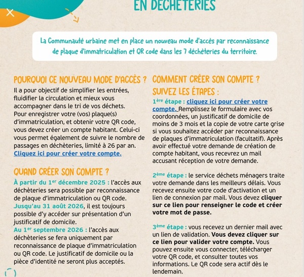 Pour simplifier les entrées et fluidifier la circulation La Communauté urbaine modernise ses déchèteries. Une nouvelle gestion d’accès sera déployée progressivement sur les 7 déchèteries du territoire pour une mise en service en septembre 2026. Objectif : fluidifier la circulation, simplifier vos...